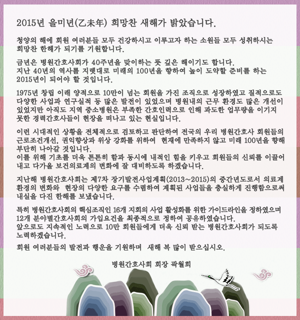 운영자 2015년 신년사 글쓴이 : 운영자 작성일 : 2015-01-06 15:54 조회 : 17,148 150107.gif (163.6K)[48]DATE : 2015-01-07 09:21:51 2015년 병원간호사회 신년사 이전글 다음글 목록