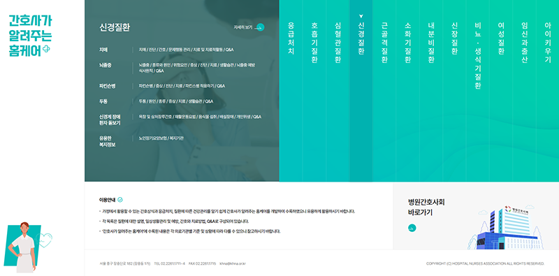본회 홍보위원회에서는 가정에서 활용할 수 있는 간호상식과 응급처치, 질환에 따른 건강관리를 알기 쉽게 수록한 ‘간호사가 알려주는 홈케어’를 리뉴얼 오픈하였다.