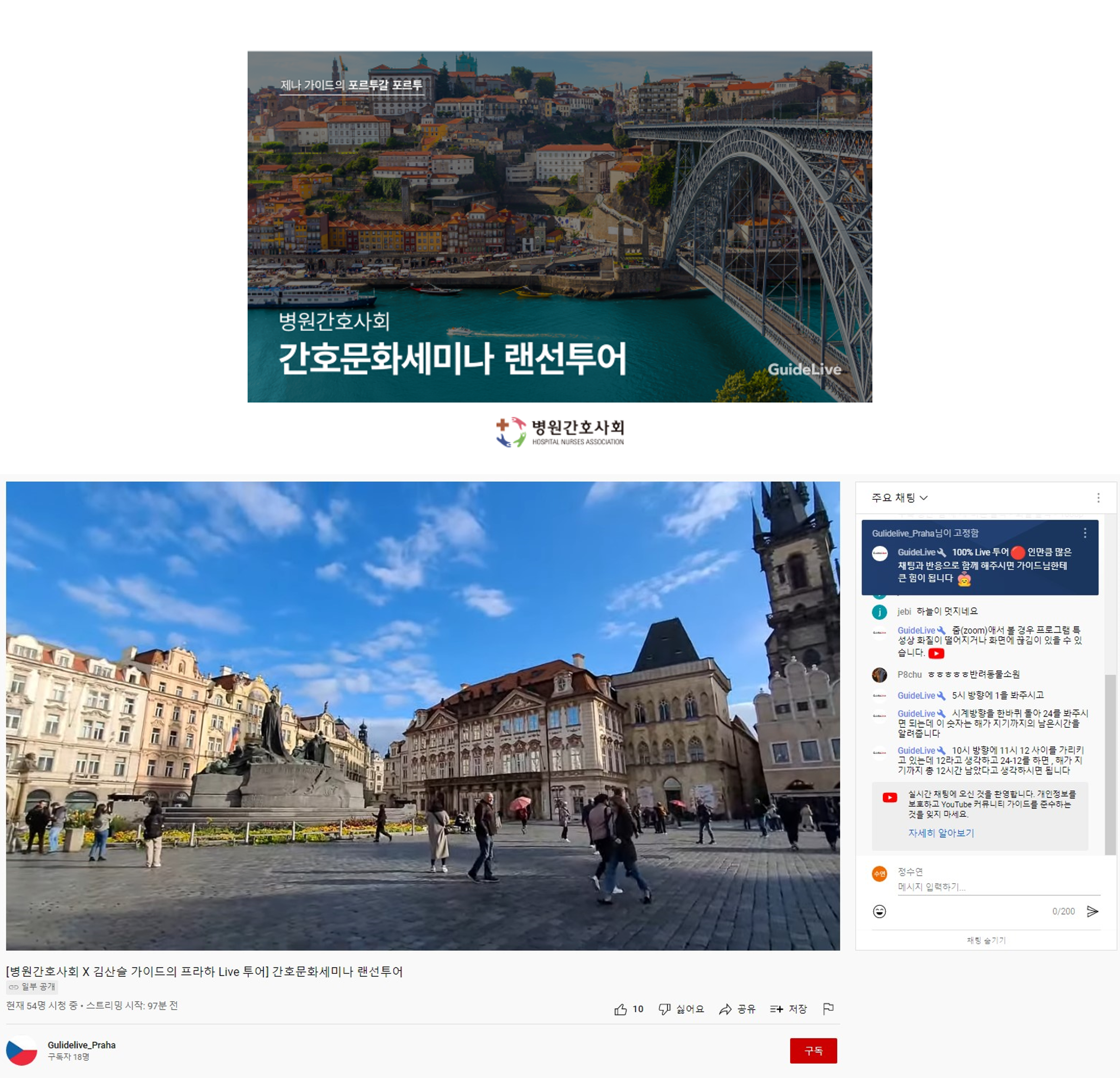 줌웨비나에서 개회사 및 랜선투어 진행 안내가 있은 후 오후 3시부터 7개 해외 도시(스페인 바르셀로나, 스페인 세비야, 오스트리아 비엔나, 이탈리아 피렌체, 체코 프라하, 튀르키예 이스탄불, 포르투갈 포르투) 현지 가이드의 유튜브 라이브를 통한 랜선투어가 1시간 30분 동안 진행되었다.