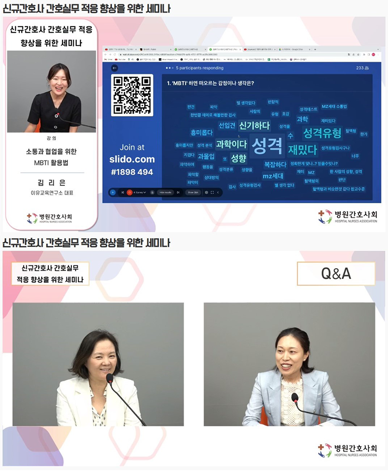이어서 ‘함께 성장하는 프리셉터쉽’이라는 주제로 오소영(서울아산병원 UM) 강사의 강의가 진행되었고 강의 후 병원간호사회 추영수 업무향상위원장(고려대학교의료원 선임간호부장 겸 안암병원 간호부장)과 함께 진행한 질의응답 시간을 통해 현장에서 교육을 담당하는 간호사들의 어려움을 함께 고민해볼 수 있는 유익한 시간을 가졌으며 ‘신규, 프리셉터에게 직접 설문한 자료를 공유해주신 점이 너무 좋았고 현장을 반영한 것이 느껴진 강의였다.’, ‘다른 병원의 프리셉터쉽 프로그램에 대해서 알 수 있어서 좋았고 마지막 Q&A 시간에 묻고 싶었던 질문들에 대한 유익한 답변을 들어서 좋았다.’, ‘프리셉터를 하는 모든 간호사분들께 추천드리는 강의’ 등의 다양한 의견이 있었다.