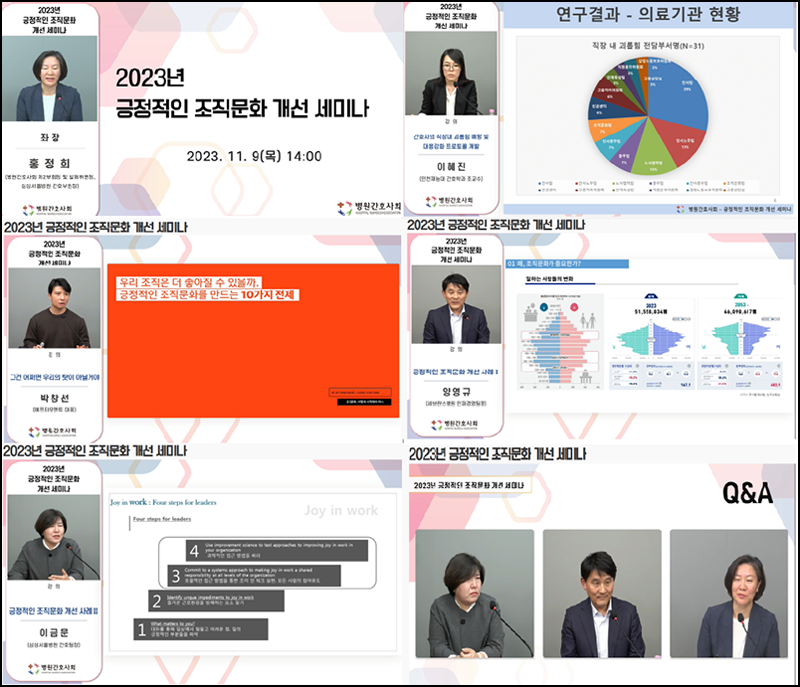 본회에서는 병원간호 역할 확대를 위한 정책적 지원 중 효율적인 인력관리를 위한 사업의 일환으로 [2023년 긍정적인 조직문화 개선 세미나]를 11월9일(목) 간호사와 간호관리자 300여명이 참여한 가운데 웨비나로 개최하였다.