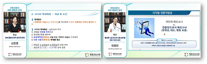 병원간호사회는 병원간호 역할확대를 위한 정책적 지원을 비롯하여 효율적인 인력관리, 간호관련 제도 개선 활동 등 다양한 사업을 진행하고 있으며 오늘날 급속히 늘어난 SNS 활동과 관련하여 바람직한 SNS 윤리에 대해 많은 간호사들과 공유하기 위하여 실시간 온라인 접속을 통한 웨비나로 진행하였다.