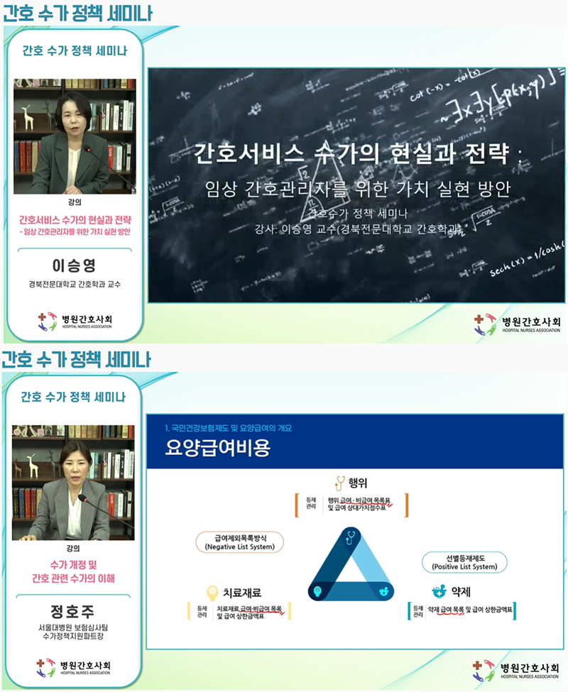 ‘간호서비스 수가의 현실과 전략: 임상 간호관리자를 위한 가치 실현 방안’을 주제로 이승영(경북전문대학교 간호학과 교수) 강사의 강의가 진행되었고, 이어서 ‘수가 개정 및 간호 관련 수가의 이해’라는 주제로 정호주(서울대학교병원 보험심사팀 수가정책지원파트장) 강사의 강의가 이어졌다.