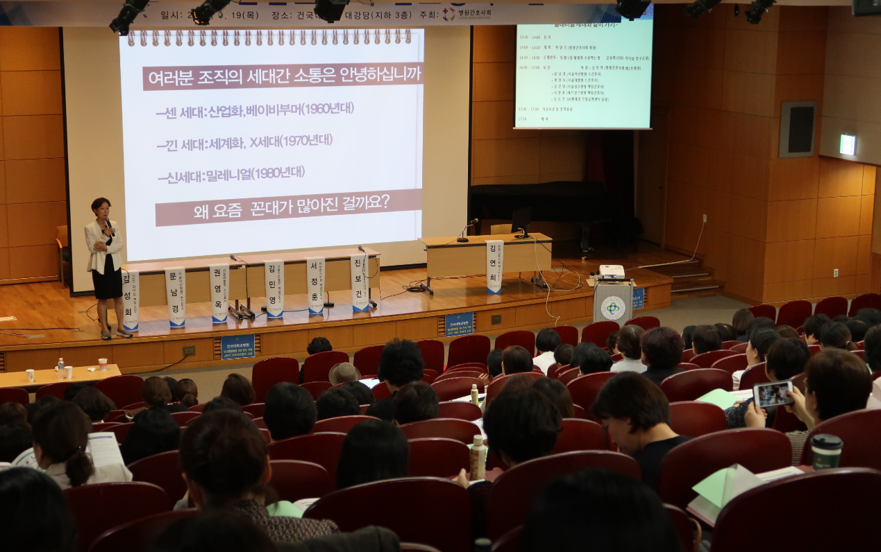 김성회 CEO 리더십 연구소장의 ‘밀레니얼 세대와 소통하는 법’에 대한 주제발표 후 이어진 토론은 김연희 병원간호사회 제1부회장이 좌장으로 진행이 되었다. 문남경 서울아산병원 수간호사, 권영옥 서울대병원 수간호사, 김민영 서울성모병원 책임간호사, 서정훈 세브란스병원 책임간호사, 진보건 SK텔레콤 기업문화센터 팀장이 토론자로 참여하여 각 병원 및 기업에서 최근 밀레니얼 세대와 소통하기 위한 노력을 공유하여 간호관리자로서 밀레니얼 세대를 이해하고 소통하기 위한 방법을 모색하고 다양한 의견을 수렴하는 시간을 가졌다.