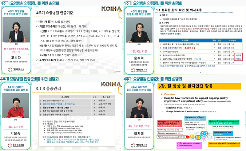 본회에서는 주기마다 의료기관 인증평가에 대비할 수 있도록 인증평가 설명회를 개최하고 있으며, 2025년 시행되는 4주기 요양병원 인증평가의 개정된 인증기준 및 간호와 관련된 내용으로 설명회를 진행하였다. 4주기 요양병원 인증기준 개정 배경 및 방향과 주요 내용에 대해 고범자 의료기관평가인증원 전담컨설턴트가 강의하였고, 각 영역의 변화된 인증기준에 대하여 윤수덕 보바스기념병원 간호부장, 박은숙 사단법인 감염관리 네트워크 고문, 천자혜 의료기관평가인증원 전담컨설턴트의 강의가 이어졌다.