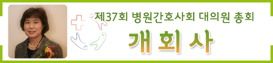 병원간호사회 발전을 위해 아낌없는 관심으로 지원해 주시는 대한간호협회 성명숙 회장님, 대한병원협회 성상철 회장님, 그리고 전임회장단 및 병원간호사를 아껴주시는 선배님들, 수상자 여러분과 내외빈 여러분을 모시고 제37회 정기총회를 개최하게 되어 기쁘게 생각합니다. 또한 특강을 맡아주실 고려대학교 허태균 교수님께도 감사드립니다.