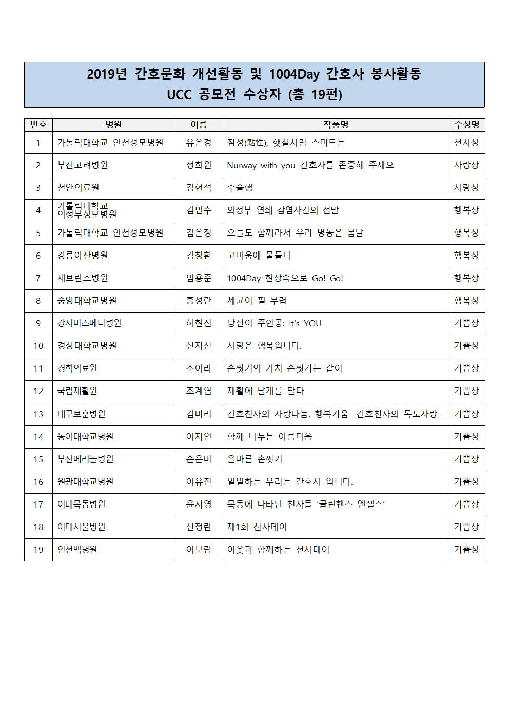 운영자 2019년 간호문화 개선활동 및 1004Day 간호사 봉사활동 UCC 공모전 수상자 글쓴이 : 운영자 작성일 : 2020-12-03 17:18 조회 : 20,022 ■ 2019 1004Day UCC 수상자001.png (76.4K)[35]DATE : 2020-12-03 17:20:38 2019년 간호문화 개선활동 및 1004Day간호사 봉사활동 UCC공모전 수상자2019년 간호문화 개선활동 및 1004Day 간호사 봉사활동 UCC 공모에 18개 병원 총 19편의 작품이 응모되었습니다. 회원 여러분들의 많은 참여 감사드리며 심사 결과를 다음과 같이 알려드립니다. ☞ 영상 보러가기 이전글 다음글 목록