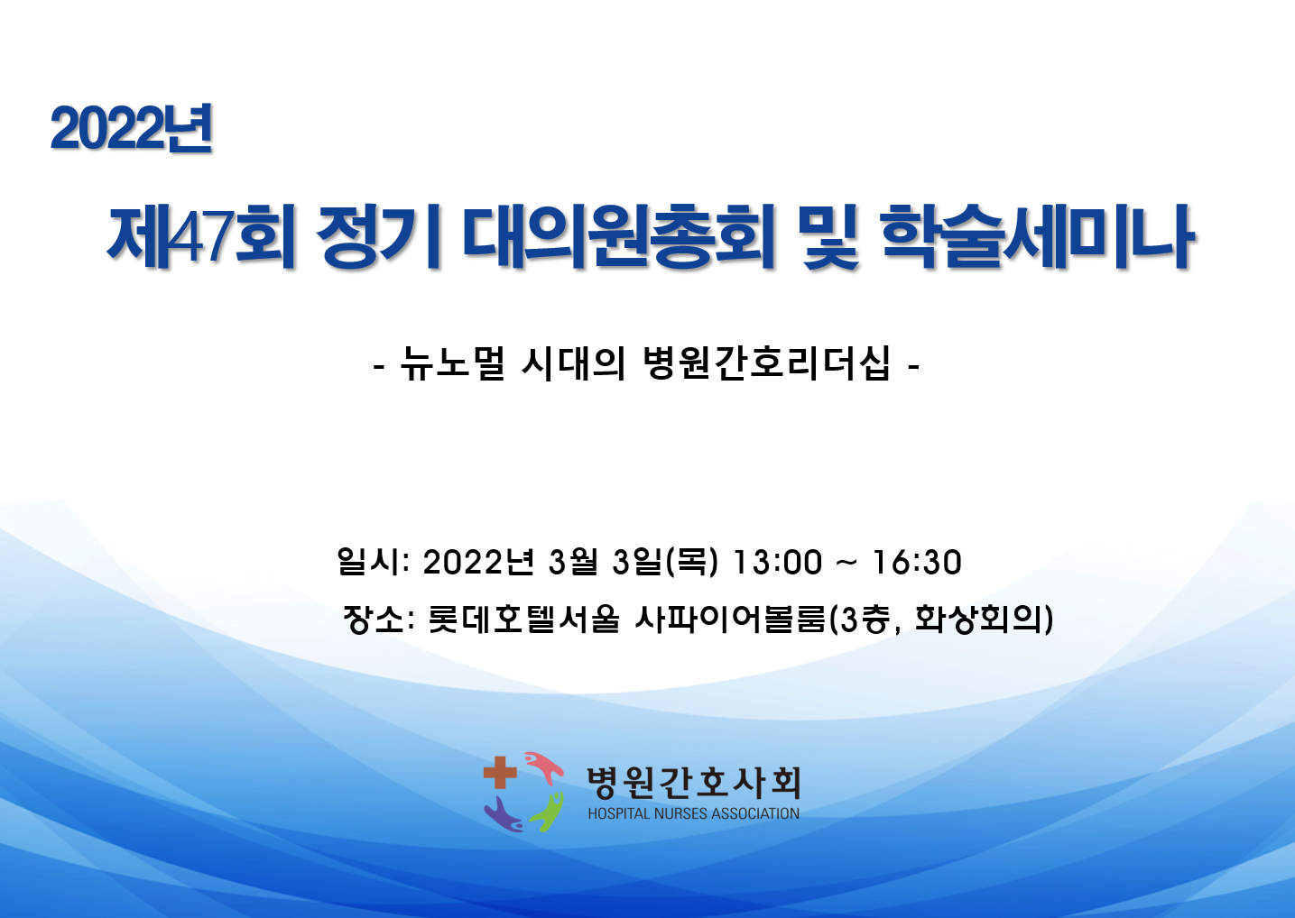 본회에서는 2022년 제47회 정기대의원총회 및 학술세미나를 ‘뉴노멀 시대의 병원간호리더십'을 주제로 3월 3일(목) 롯데호텔서울 사파이어볼룸에서 개최한다.