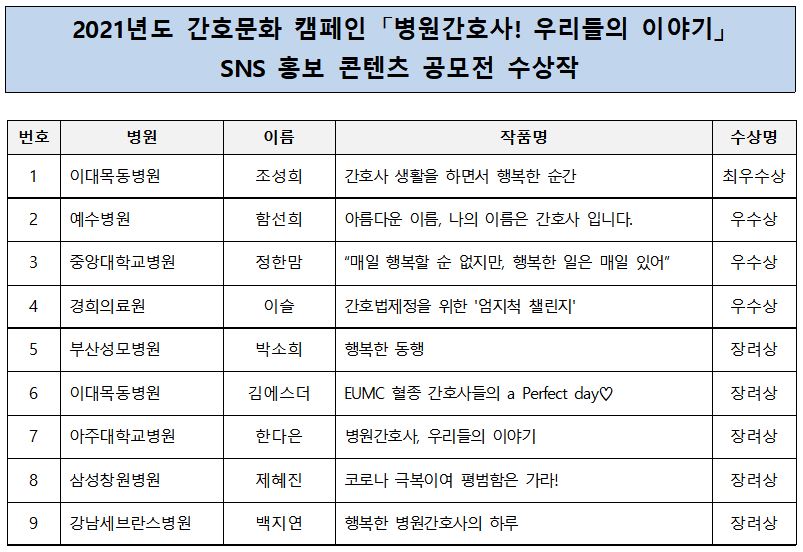 운영자 2021년 간호문화 캠페인 「병원간호사! 우리들의 이야기」 SNS 홍보 콘텐츠 공모전 수상작 글쓴이 : 운영자 작성일 : 2022-03-04 14:31 조회 : 20,263 2021년 간호문화 캠페인 「병원간호사! 우리들의 이야기」 SNS 홍보 콘텐츠 공모 수상작2021년 간호문화 캠페인 「병원간호사! 우리들의 이야기」 SNS 홍보 콘텐츠 공모에 16개 병원 총 47편의 작품이 응모되었습니다. 회원 여러분들의 많은 참여 감사드리며 심사 결과를 다음과 같이 알려드립니다. 이전글 다음글 목록