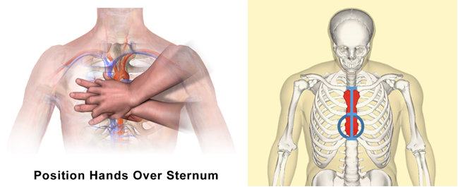 가슴압박의 위치는 흉골의 아래쪽 절반에 해당됩니다. 구조자는 환자의 가슴 옆에 무릎을 꿇은 자세를 취하고, 한 쪽 손바닥을 압박 위치에 대고 그 위에 다른 손바닥을 평행하게 겹쳐 두 손으로 압박합니다. 이때 손가락은 펴거나 깍지를 끼며, 가슴에 닿지 않도록 하며, 팔꿈치를 펴고 팔이 바닥에 수직을 이룬 상태에서 체중을 이용하여 압박합니다. 가슴 압박 시에는 강하게 규칙적으로, 그리고 빠르게 압박해야 하며, 압박의 속도는 적어도 분당 100~120회를 유지하고, 압박 깊이는 5cm 깊이를 권고합니다. 가슴압박의 중단을 10초 이내로 최소화할 것을 제안합니다.