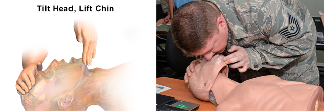 한 손을 환자의 이마에 대고 손바닥으로 압력을 가하여 환자의 머리가 뒤로 기울어지게 하면서, 다른 손의 손가락으로 아래턱의 뼈 부분을 머리 쪽으로 당겨 턱을 받쳐주어 머리를 뒤로 기울여 (머리 젖히고-턱들기 방법) 기도를 유지합니다. 환자의 코를 막은 다음 구조자의 입을 환자의 입에 밀착시켜 환자의 가슴이 올라오도록 호흡을 불어넣습니다. 인공호흡은 “보통 호흡(구조자가 숨을 깊이 들이쉬는 것이 아니라 평상 시 호흡과 같은 양을 들이쉬는 것)”을 1초 동안 환자에게 불어넣는 것입니다. 첫 번째 인공호흡을 시도했을 때 환자의 가슴이 상승되지 않는다면 머리 젖히고-턱들기를 정확히 다시 한 다음에 두번째 인공호흡을 시행합니다. 혹시 심폐소생술 교육을 받은 적이 없거나, 받았더라도 자신이 없는 경우, 혹은 인공호흡에 대해 거부감을 가진 경우에는 인공호흡을 하지 않고 가슴압박만 하더라도 아무것도 하지 않는 경우에 비하여 심정지 환자의 생존율을 높일 수 있으므로 가슴압박 소생술을 하도록 권장합니다.