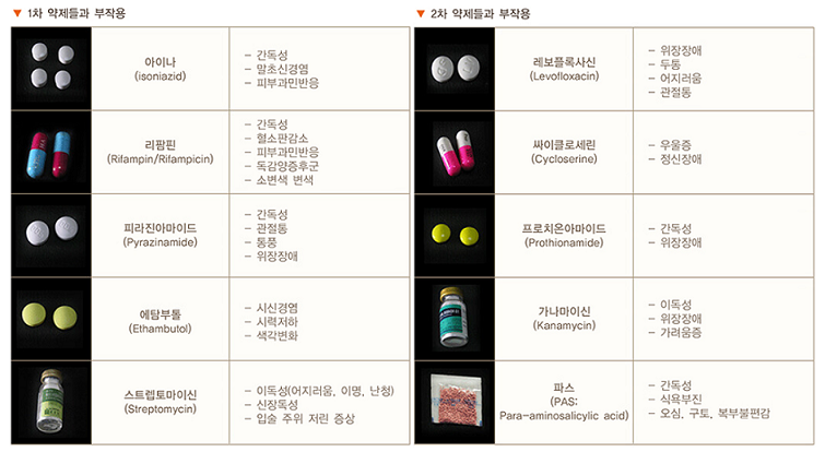 결핵은 올바른 약복용을 통해 완치될 수 있는 질병입니다. 환자의 상태에 따라 치료기간은 6~18개월 이상이 걸리며, 무엇보다도 “전문의에 의한 적절한 약제처방”, “규칙적이고 정확한 복용”, “치료를 완료할 수 있도록 도와주는 환자관리”가 중요합니다. 항결핵제는 1940년대에 스트렙토마이신(streptomycin, S), 파스(p-aminosalicylic acid, PAS)가 결핵치료에 처음 도입되었고, 이후 이소니아지드(isoniazid, INH, H), 피라진아미드(pyrazinamide, Z), 에탐부톨(ethambutol, E), 리팜핀(rifampin, R) 등 효과적인 항결핵제들이 차례로 개발되어 이들 약제들을 적절히 조합하여 치료하면 대부분의 결핵이 완치가 가능하게 되었습니다. 항결핵제는 일반적으로 일차 항결핵제(first-line drug)와 이차 항결핵제(second-line drug)로 구분됩니다. 항 결핵 효과가 좋을 뿐 아니라 부작용이 적어서 초치료 결핵에 사용되는 약제들을 일차 항결핵제라고 하며, 이에 비하여 항결핵 효과가 낮고 부작용이 많아 일차 항결핵제를 내성이나 부작용으로 사용할 수 없을 경우에만 주로 사용되는 약제들을 이차 항결핵제라고 부릅니다.