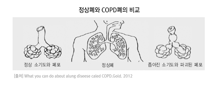 만성 폐쇄성 폐질환(Chronic obstructive pulmonary disease, COPD)는 유해한 입자나 가스의 흡입에 의해 폐에 비정상적인 염증 반응이 일어나면서 이로 인해 점차 기류 제한이 진행되어 폐기능이 저하되고 호흡곤란을 유발하게 되는 호흡기 질환입니다.