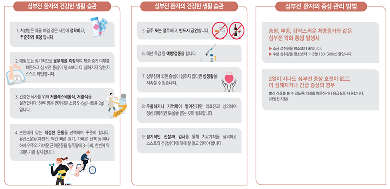 심부전은 짧은 시간에 완치되는 병이라기보다 오랜 기간에 걸쳐 잘 관리해야 하는 병으로 환자 스스로가 약을 꾸준히 복용하면서 자신의 건강상태를 잘 확인하고 건강한 생활습관을 유지해야 합니다.