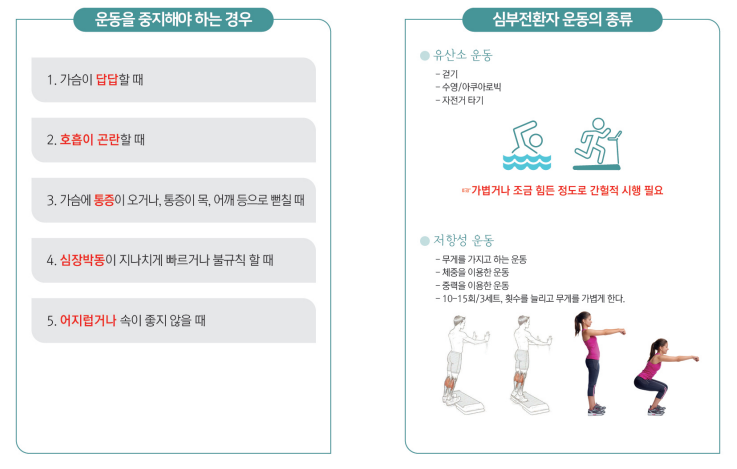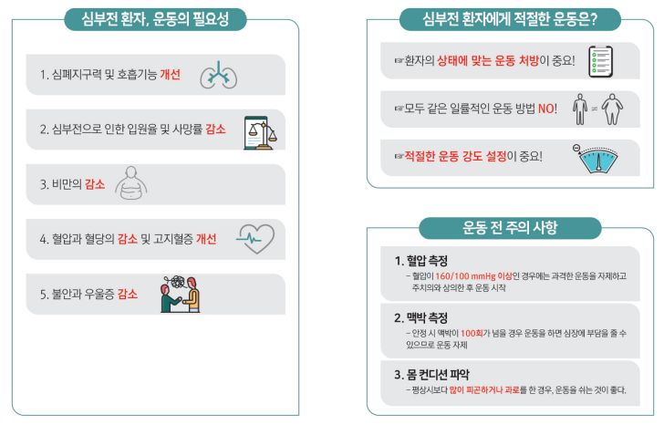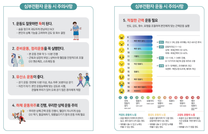 - 1) 심부전 환자의 운동 : 일주일에 3~5일, 하루에 30~45분