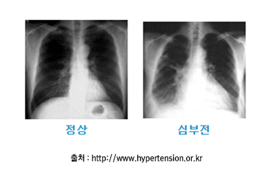 고혈압을 치료하지 않고 방치하면 심장에 부담을 주어 심장벽이 두꺼워지고 심장이 커지게 됩니다. 이로 인해 시간이 지나면서 심장 기능이 떨어져 체내에 필요한 혈액량을 공급하지 못하게 되는데, 이를 심부전이라고 하며 고혈압 환자에서 정상인보다 4배 더 발생합니다. 움직일 때 숨찬 증상이 나타나게 되고 운동능력이 떨어지며, 심부전이 더 진행하면 폐에 물이 차게 되는 폐부종이 발생할 수도 있습니다.