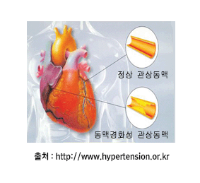 고혈압은 급성 심근경색증 발생에 관여하며, 관상동맥질환은 정상인보다 3배 더 발생합니다. 수축기 혈압이 140mmHg 이상이면 모든 연령에서 허혈성 심질환의 발생이 매우 가파르게 증가합니다. 심장 자체에 혈액을 공급해주는 관상동맥에 경화증이 진행되어 심장 근육에 혈류 부족 상태가 생기면, 협심증, 심근경색 등이 발생되는 데, 혈류의 일시적인 장애로 인한 협심증 증상은 신체활동 시 가슴 중앙부에 약 2~3분 정도 지속되는 압박감 또는 쥐어짜는 듯한 느낌으로 나타나고, 심근경색증은 관상동맥이 완전히 막혀 심장 근육이 괴사하는 경우로서 더 심한 통증이 오며 곧바로 사망할 수 있습니다.