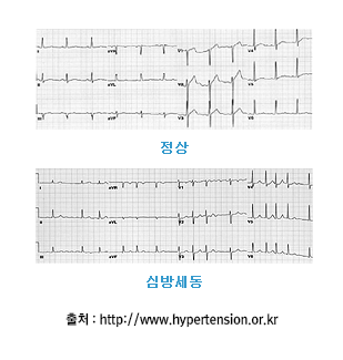 고혈압은 심방세동 등의 부정맥을 일으키기도 하는데, 특히 고혈압 환자가 심부전을 동반한 경우에는 40% 정도에서 심방세동이 동시에 발생할 수 있습니다. 이러한 심방세동은 뇌졸중(중풍)을 일으킬 수 있는 중요한 원인입니다.