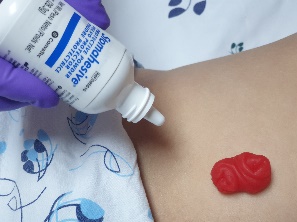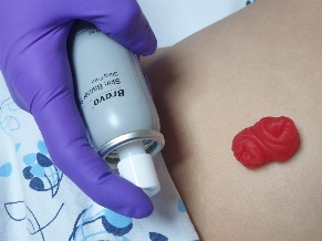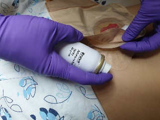 만약 장루 주위 피부에 상처가 있다면 손상 부위에 피부보호 파우더와 피부보호 필름을 가볍게 뿌려줍니다.