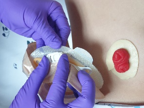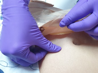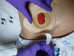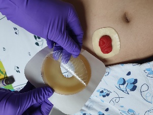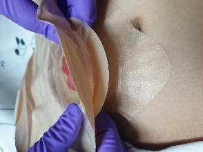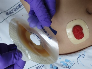 피부보호판을 장루에 맞게 잘 부착하고 피부보호판 주위의 종이 테이프를 제거합니다.