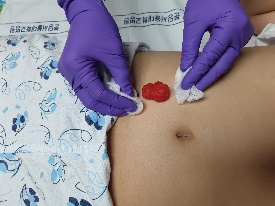 장루주위 피부를 젖은 거즈나 물티슈로 두드리듯이 가볍고 깨끗하게 닦습니다.