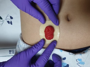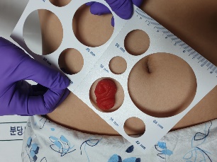 모양자를 이용하여 장루 크기를 측정하고 준비된 피부보호판의 뒷면에 장루 모양에 맞추어 그림을 그립니다. |