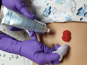 틈새 연고를 장루와 피부의 경계면 또는 피부보호판의 뒷면에 오려낸 모양에 맞추어 바릅니다.