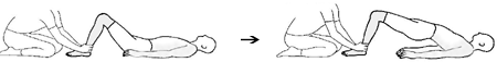 - 잘 올라가지 않을 경우에는 간호인의 무릎으로 발목을 눌러 양손으로 허리들기를 돕습니다.