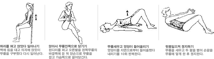 많은 여성들이 임신과 출산, 노화, 과체중 등으로 인하여 골반저 부위의 근력이 약화됨으로써 요실금을 경험하게 됩니다. 일상생활에서 골반저 부위의 근력을 강화시키는 체조를 규칙적으로 시행함으로써 요실금을 예방하고 치료할 수 있습니다. 다음의 요실금 체조는 골반부위를 둘러싸고 있는 근육을 단련시키기 위한 동작들입니다. 같은 동작을 반복적으로 실시하는 것이 중요합니다. 매일 규칙적으로 시행하십시오.