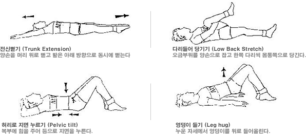 다음의 요통체조는 수술 후 1개월 이내에 할 수 있는 아주 가벼운 동작입니다. 수술 후에는 관절의 가동범위를 넓혀 주는 것이 무엇보다 중요하므로 통증이 없는 범위 내에서 이러한 동작들을 시행하십시오.