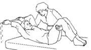 머리와 어깨를 적당한 크기의 베개로 지지하여 목이 과도하게 꺾이는 것을 막아 줍니다. 엉덩이 옆에 돌돌 말은 수건을 두어 대퇴가 밖으로 휘는 것을 막아 줍니다. 손가락이 굽어진 채로 있지 않도록 돌돌 만 수건을 잡게 합니다. 베개를 받쳐 팔을 올림으로써 팔의 부종을 막아 줍는다.