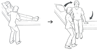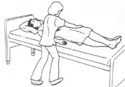 - - 간호인이 서 있는 방향으로 환자를 돌리면서 환자의 다리를 침상가로 내려뜨립니다.