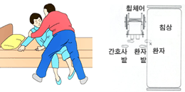 - - 환자가 무릎을 세운 채 발에 힘을 가하여 침요를 밀어내 듯이 올라갈 때, 간호인은 환자의 어깨와 엉덩이 밑에 손을 넣어 침상머리로 같이 올립니다.