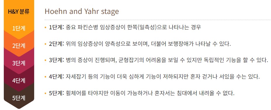 파킨슨병 또한 다른 질병과 마찬가지로, 시간이 지나면서 점점 더 악화되며, 그 진행 결과는 다음과 같은 5단계로 구분할 수 있습니다. 파킨슨병은 과거에는 발병 5년 이내에 25%의 환자가 무능력해지거나 사망에 이르며, 발병 후 15년 안에는 89%의 환자가 사망하는 질병이었습니다. 그러나 지금은 다양한 치료법 및 치료제의 개발로, 초기 진단 및 전문의에게 정확한 치료를 받는다면 충분히 건강한 삶을 되찾을 수 있습니다.