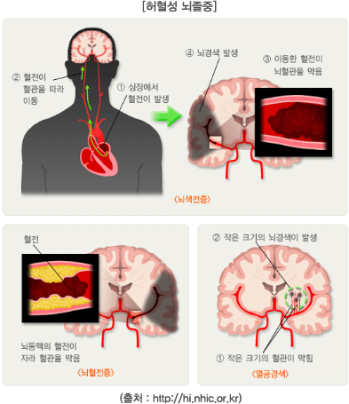 어떤 원인에 의해 뇌혈류가 줄어들거나 중단되면 궁극적으로는 뇌 조직이 죽게 되는 뇌경색 상태가 되고 이러한 뇌조직의 괴사를 허혈성 뇌졸중이라고 부릅니다. 허혈성 뇌졸중은 전체 뇌졸중의 약 80%를 차지하고 그 원인의 대부분은 ‘혈전’이라고 하며 응고된 혈액 덩어리가 뇌에 산소와 영양분을 공급하는 혈관을 막아서 발생합니다. 혈액응고는 우리 몸에서 지혈 작용을 한다거나 몸에 상처가 났을 때 혈관들이 회복되는 것을 돕는 매우 유익한 과정이나, 혈관 안에서 발생하여 혈액의 흐름을 막는다면 끔직한 결과를 초래할 수도 있는 것입니다. 응고된 혈액 덩어리들은 2가지 경로를 통해서 뇌경색과 뇌허혈을 유발하는 것으로 알려져 있습니다. 첫 번째 경로는 심장에서 만들어진 혈전이 혈관을 따라 이동하여 뇌동맥을 막는 것이며 이것을 ‘뇌색전증’이라고 합니다. 두 번째 경로는 뇌혈관 벽에서 자라나는 혈전에 의해 혈관이 점점 좁아지다가 막히는 것으로 이러한 뇌손상을 ‘뇌혈전증’이라고 합니다.한편, 비교적 큰 뇌동맥에서 발생하는 뇌색전증이나 뇌혈전증 외에 이러한 대뇌동맥에서 수직으로 분지하는 관통동맥이라는 작은 혈관이 막히면서 발생하는 비교적 작은 크기의 뇌경색을 ‘열공경색’이라고 부릅니다. 이외에 뇌혈관이 막히지는 않고 좁아져서 뇌혈류가 매우 감소하는 경우에도 허혈성 뇌손상을 유발할 수 있습니다. 이 경우는 원인 질환으로 대뇌동맥의 동맥경화증이 동반됩니다.