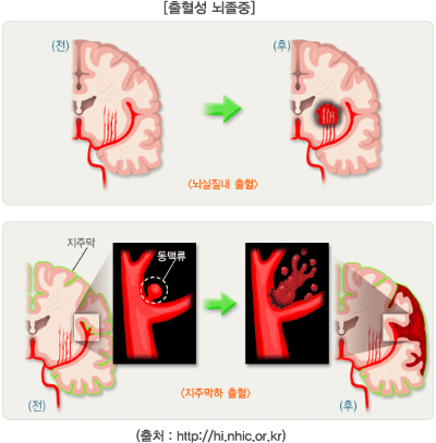 - 뇌내 출혈은 소위 뇌 속(실질)에서 혈관이 파열된 것으로 전체 뇌졸중의 10% 정도를 차지합니다. 뇌내 출혈의 예후는 나쁘며, 첫 48시간 이내 사망이 총 사망의 50%를 차지합니다. 가장 중요한 원인은 고혈압이며, 그 외 원인으로 혈관기형, 응고장애, 항응고제나 혈전용해제, 외상, 뇌종양, 동맥류파열 등이 있습니다.