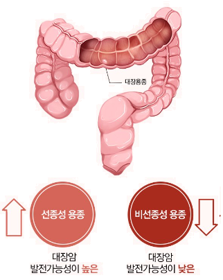 용종은 대부분 양성 종양입니다. 암으로 발전할 가능성이 있는 신생물성 용종(선종)과 그 외 염증성 용종, 증식성 용종, 과오종 등으로 나눌 수 있습니다. 선종은 대장암으로 진행할 수 있어 제거해야 합니다. 염증성, 증식성, 과오종 용종은 추적 관찰하는 경우가 많습니다. 증식성 용종으로 분류되었던 톱니모양의 용종도 대장암으로 진행될 수 있어 제거해야 합니다.