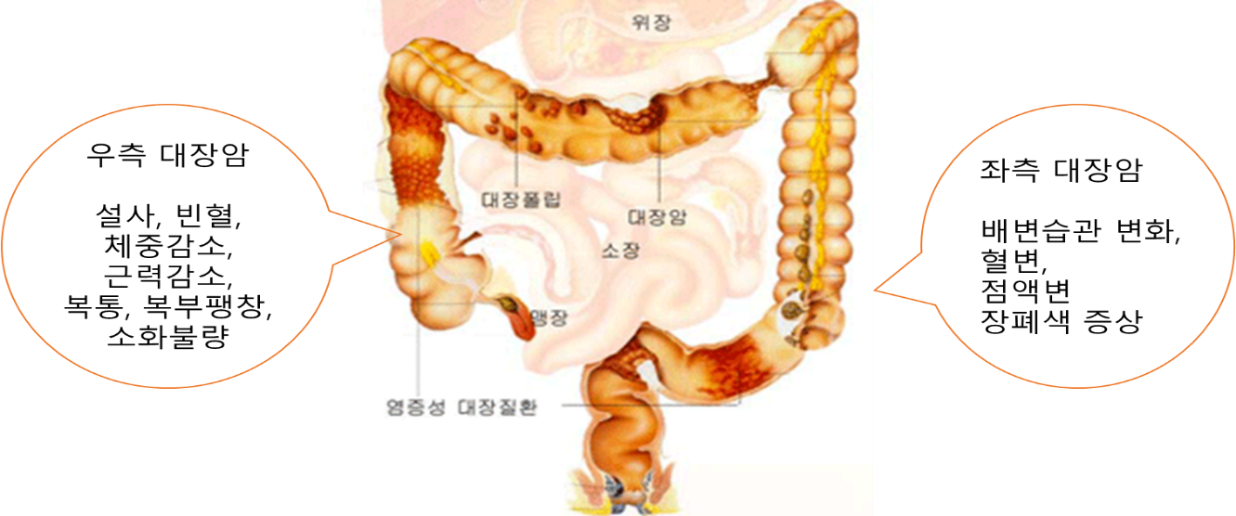 대장암은 결장과 직장에 생기는 악성의 종양을 말하며 암이 발생하는 위치에 따라 결장에 생기는 암을 결장암, 직장에 생기는 암을 직장암이라고 하고 이를 통칭하여 대장암 혹은 결장직장암이라고 합니다. 점막에서 생기는 선암이 대부분으로 선암으로 발전하기 전 용종의 형태로 대장내시경을 통해 용종 유무를 발견하는 것이 중요합니다.
