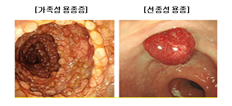 용종이란 장 점막의 일부가 점막 표면보다 돌출하여 마치 혹처럼 형성된 병변을 말합니다. 용종은 양성종양이지만 악성으로 진행할 수 있는 것으로 알려져 있습니다.