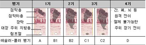 - 2기 : 암이 대장벽을 넘어섰지만 인접장기까지 미치지 않아 수술 후 재발방지 항암치료 5년간 관찰 필요