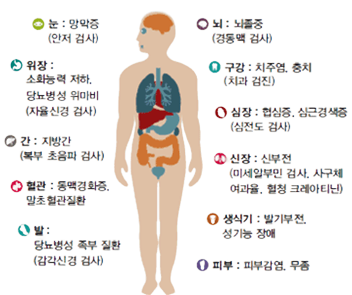 종류 : 눈(당뇨병망막병증), 신장(당뇨병신장질환), 신경(당뇨병신경병증)