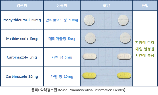 시작할 때 다량의 약을 복용하고 증상이 호전되면 점차 줄여 유지용량으로 복용을 합니다. 정기적으로 갑상선 기능 검사를 시행하여 약물의 효과를 평가하여야 합니다. 부작용으로 두드러기, 피부반점, 가려움증, 간기능장애, 백혈구 감소증이 있을 수 있습니다. 약제 복용 중 갑자기 고열과 목이 아픈 증상이 발생하면 즉시 약을 중단 후 병원 방문이 필요합니다. 소아, 청소년기 환자, 임신 중이나 수유 중일 때 약물요법이 선호되며 그 외의 경우에는 환자 개개인의 상황에 따라 의료진이 권유하는 방법으로 치료를 받으면 됩니다.