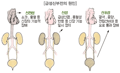 급성 신부전의 원인은 다음과 같이 크게 세 가지로 나누어 볼 수 있습니다.