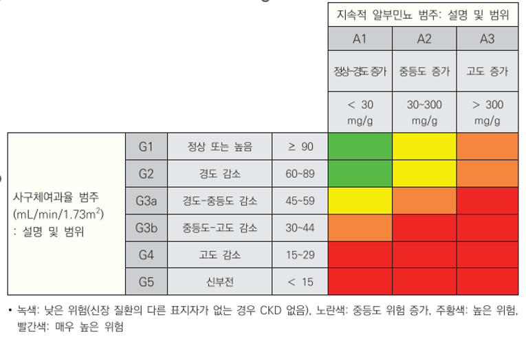<사구체여과율 및 알부민뇨 범주에 따른 만성콩팥병의 단계와 예후 : KDIGO 2023>