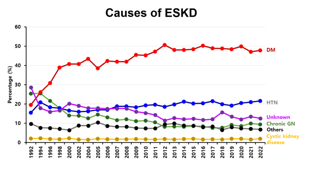 2022년 대한 신장학회의 통계에 따르면 말기콩팥병의 원인 질환은 당뇨병이 47.8%로 가장 많은 원인을 차지하고 있으며 고혈압 21.5%, 사구체신염 9.4%, 낭성 신질환 1.9%의 순서로 원인을 차지하였습니다. 이외에 기타 질환 6.8%, 원인 미상 12.5%의 분포를 보였습니다.