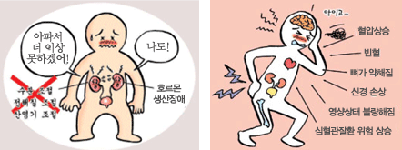 - - 신장은 심박출량의 20%나 공급받는 혈류량이 매우 높은 장기입니다. 또한 신장 혈관은 보다 노폐물 배설을 잘 할 수 있도록 사구체라고 부르는 매우 정교하고도 가느다란 모세혈관 덩어리로 구성되어 있습니다. 고혈압은 사구체에 심각한 손상을 일으키므로, 적극적으로 고혈압 치료를 하면서 혈압을 자주 재보고, 적절한 약제를 선택하여 사용하여야 합니다.