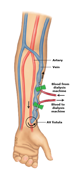 혈액투석을 하기 위해서는 분당 200~300ml의 혈액을 빼내고 넣어 주어야 하는데 일반 말초 혈관으로는 충분한 혈액을 빼내기 힘들므로 체내의 동맥과 정맥을 연결하여 주는 수술이 요구됩니다. 이러한 수술은 부분 마취로 수술실에서 하게 되며 수술 부위는 대부분이 손목 1~2인치 위에 위치하게 됩니다. 혈관 수술을 하게 되면 체내의 정맥 혈관에 동맥혈이 흐르게 되어 팔의 정맥이 커지고 강해지게 되므로 수술 부위를 만져보면 찌릿찌릿한 전기 오르는 느낌이 느껴지며, 수술 부위에 청진기를 대고 들어보면 윙윙거리는 잡음이 들립니다. 이러한 느낌과 소리가 있어야 수술이 잘 된 것이며 수술 후 투석에 이용될 수 있을 정도로 충분히 혈관이 커지는 데는 최소 4~6주(당뇨 환자의 경우 2달)이 걸리며 이때 혈관이 확장되는 운동을 하도록 교육받게 됩니다. 그러므로 의사가 지시하는 시기에 혈관 수술을 하여 미리 혈관을 준비하는 것이 좋습니다.
