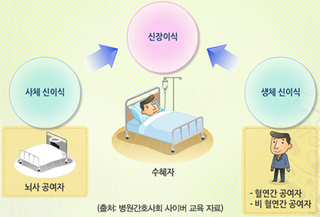 - 생체이식의 기증자는 부모, 자녀, 형제, 부부 혹은 친척, 친구로부터 이루어질 수 있습니다. 비윤리적이고 상업적인 신장 거래행위는 뚜렷한 불법행위로 입법화된 상황입니다.