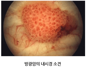 - - 방광경은 방광암의 진단에 가장 중요하다. 전체 방광 내부뿐 아니라 전립선요도를 포함하여 요도도 완전히 검사하여야 한다. 방광경 검사 시 종양의 모양, 크기, 범위 및 다발성 여부 그리고 방광과 전립선 요도 점막에 이상 병변이 함께 있는지 여부를 살핀다.