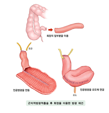 - - 근치적 적출술 후 방광을 대체할 수술 방법을 선택하는 것은 환자의 삶의 질과 자아상을 결정하는 데 매우 중요한 결정이다. 크게 회장도관으로 복부에 요루를 만들어 복벽에 소변을 수집할 수 있는 장치를 착용하는 방법과 회장을 이용하여 방광모양의 소변을 축척할 수 있는 저장주머니를 만들어 정상적으로 자가 배뇨할 수 있는 정위성 방광대치술(인공방광) 중 어떤 술기를 선택해야 할 지 결정해야 한다. 요도와 방광목 부위의 종양 침범이 없다면, 대부분의 경우 정위성 인공방광대치술을 시행하는 방향으로 정해지게 된다.